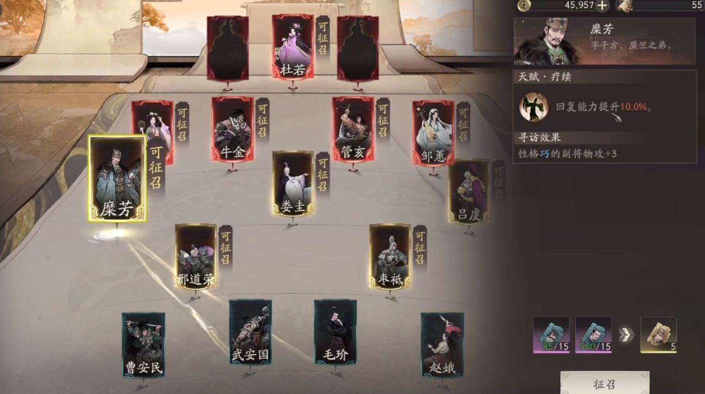 1、糜芳的天赋技能:续疗,可以加强糜芳的治疗效果,让治疗量增加10%,不仅可以提升自身的回血能力,在作为副将辅助的时候会更加稳定。