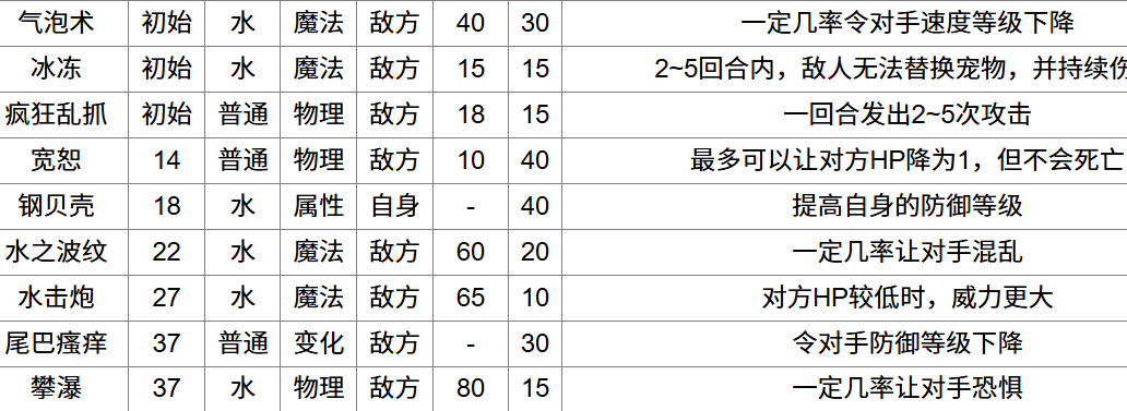 宽恕这个技能虽然是普通的物理攻击技能,这个技能最有一个关键的用处就能能够把对方的hp下降到1点,尾巴瘙痒则是能够使对方的防御等级下降,攀瀑会有一定的几率让玩家陷入到恐惧之中,水打击则能够给敌人造成90点的伤害,这一套技能主打的就是先降低敌方的防御和hp,让敌人陷入到恐惧在进行收割。