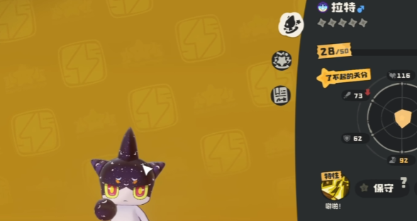 抓到拉特后先把等级升到40级,它会第一次进化成酷拉之后继续练级,等满足条件就能进化成终极形态风暴酷拉,而异色炫彩的外观,就是在进化成风暴酷拉这个阶段,靠变异玩法随机解锁的,不是每一只都能出,养成的时候性格选择特别关键,因为拉特主要靠魔攻打伤害,所以优先选保守、稳重这种能提升魔攻的性格,要是想让它出手更快,胆小、急躁这类加速度又不削弱魔攻的性格也很合适。