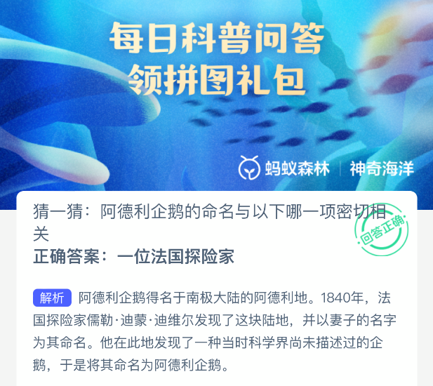 猜一猜:阿德利企鹅的命名与以下哪一项密切相关?【神奇海洋】11月11日新题目已开答!正确答案现已公布,点击领取拼图,一起为修复海洋生态贡献力量!今日正确答案是:【一位法国探险家】。阿德利企鹅得名于南极大陆的阿德利地。1840年,法国探险家儒勒·迪蒙·迪维尔发现了这块陆地,并以妻子的名字为其命名。