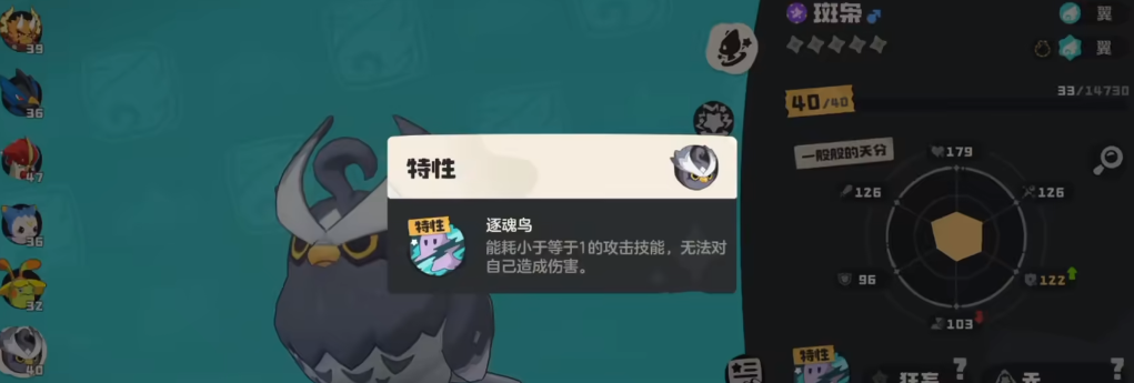 该战术的核心在于斑枭的一项特殊能力:当受到能耗低于1点的技能攻击时,能够完全免疫该次伤害。这项特性使得斑枭在对抗使用零能耗技能的精灵时具备极强的生存能力。借助此机制,斑枭可以在不承受任何伤害的情况下站场,为后续叠加增益效果创造绝佳条件,逐步建立起压倒性的战斗力优势。