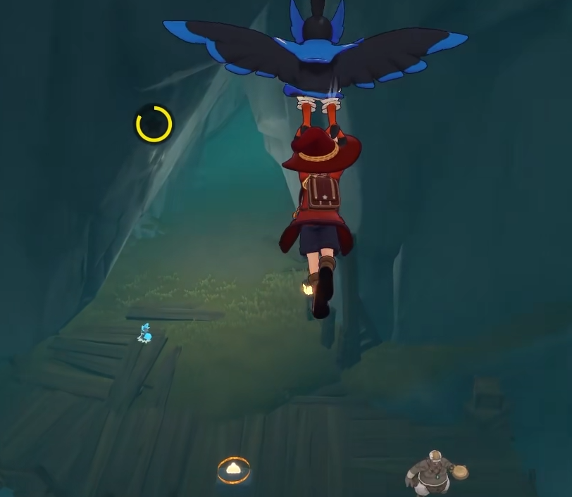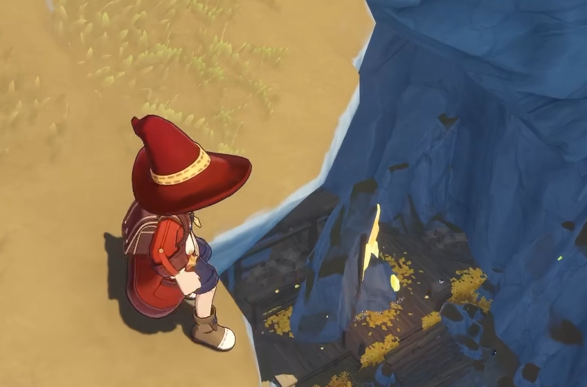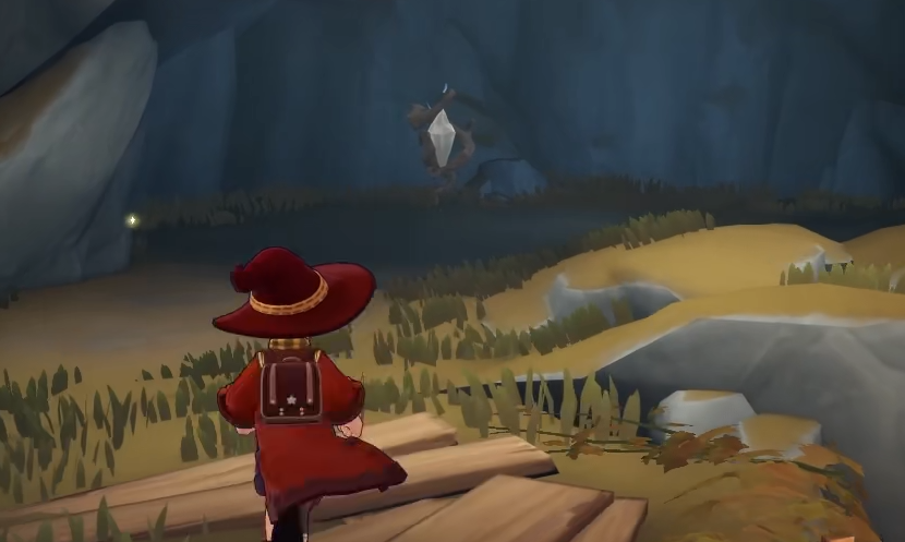 在左下方可以发现几块木板结构,并能看到一名NPC角色。此时召唤飞行坐骑,朝该人物所在位置飞行。落地后会出现一个洞穴入口,进入洞穴内部后,左侧设有一架木质梯子。攀爬上去后继续前行,即可抵达信仰者之村的核心区域——魔力之源所在点。