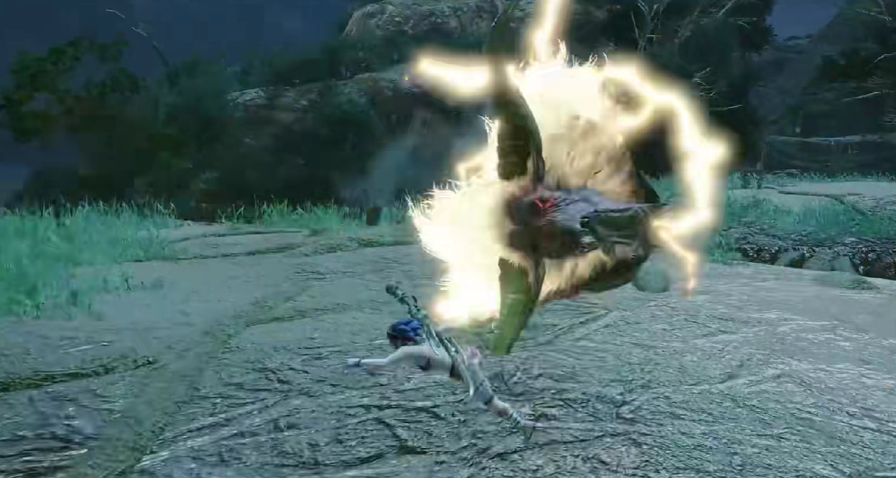 当然,玩家也可以使用双刀进行对决,在输出期间,玩家需要保持自己鬼人化的输出状态,在怪物疯狂摆动尾巴期间,会迅速下压,此时玩家即可攻击,对其使用乱舞攻击,直接命中头部。