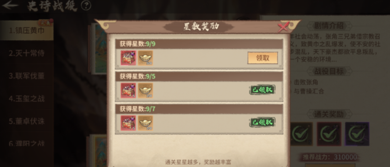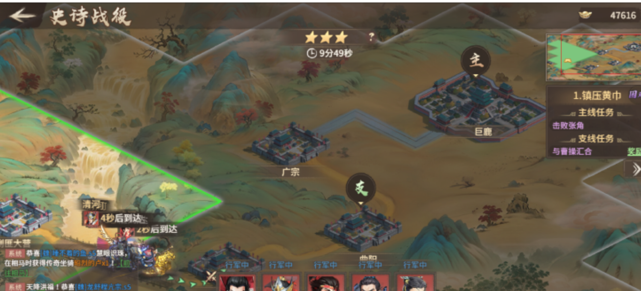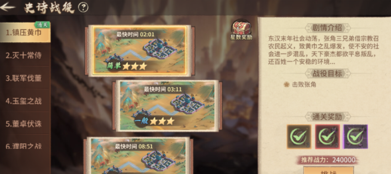 史诗战役前期的重点就是打牢根基,稳固队伍。系统赠送的武将张飞、太史慈、黄忠等都可以承担前期的输出或者控制任务。主力培养方面,要集中资源提高核心武将的等级、装备和技能,保证通关效率。通关时间的压缩要以熟悉地形、敌方兵种为前提,比如先消灭高输出或者控制型武将,再消灭辅助部队。前期要避免过早冒险,合理运用怒气技以及技能之间的配合,保证每次战斗都能达到任务的目的,拿到基本的奖励和星级,为之后通关高难度关卡打下基础。