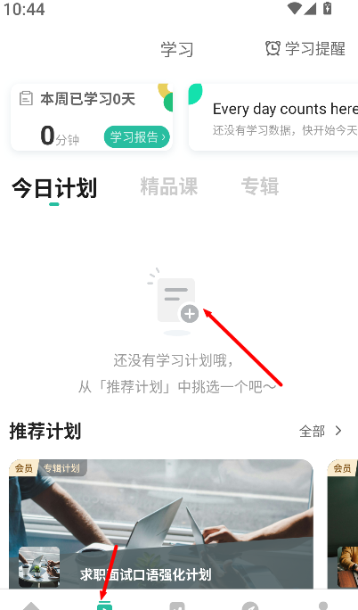 3、进入学习板块后,可根据自身需求添加学习计划,选择听力或口语模块,系统将根据设定内容进行课程推送与练习安排。