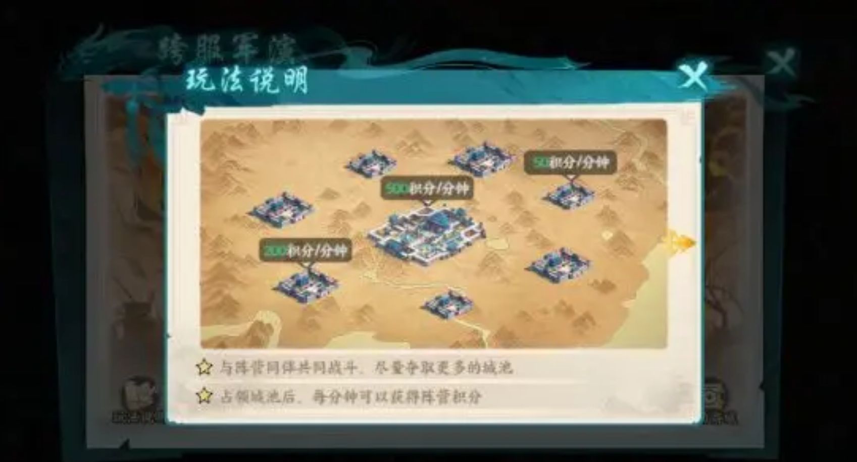 跨服军演的玩法也比较简单,规则也很好懂,各位会与他人一同组成不同的阵营,通过与对手阵营交战来占领城池,每成功占领一处城池,该城池都会持续为己方阵营产出积分。此外,各位也能在跨服军演的地图上与随机刷出来的各类事件交互,完成事件任务,以此来令己方阵营能获得更多的积分收入。这些事件可分为三种不同的类型,有的需要人们运送物资达到指定的地点,有的则需要与指定的流寇或异兽交战,其中只有送货和剿灭流寇能获得积分,与异兽作战只会增加战功。
