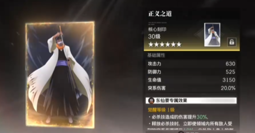 核心刻印首推正义之道,正义之道是东仙要的专属刻印,使用后他就能够提升等级,必杀技所带来的伤害也会提升到30%,若是敌人是在东仙要的技能领域中受伤的,那所伤的伤害还会在次提升,双重加伤害的效果让他清怪的效率变得更为迅速。