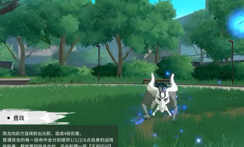 石田雨龙的普通攻击可以向前方连续的射出光箭,光箭可以给敌人造成4段式的伤害,每一段普攻在击中敌人的时候都会提供1、1、2、6点自身的战场技能量,当到了第四段攻击的时候还会积攒上一层灭却印记。