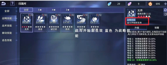 战略技能:战斗开始前生效、全局生效、多为控制、减益、角色死亡依旧有效