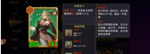 妖族阵容:遇到大秦扎堆的阵容,也可以选择妖族,就能迅速的逆势翻盘。不少人都会觉得在妖族中关键的是玉面狐狸,其实并非如此,关键在于铁扇公主。在目前的版本中,铁扇公主已经大幅度的加强,以前还要触发血在2才能够加工,现在只要召唤友方的妖阵营部甲,就可以有效提升永久的攻击。一旦在成型之后就会拥有可怕的输出。妖族之所以如此的强悍,就靠两个角色,第1个就是白骨夫人。只要友方的妖阵营阵亡一个,那就会让所有的妖将获得永久的加成,因此就能够直接触发属性加成。