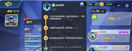 可以先看一下数值面板进攻能力里面两分球的数值就直接拉到388,所以就会超过许多的角色。耐力属性以及防守属性也会处于中等偏上的水平,速度表还有控球的表现都是比较均衡的,是一个攻强守稳的全能性配置。这样的面板,再搭配核心的天赋,仙风道骨之后,就可以直接奠定王者的地位。天赋技能迷踪后仰就仿佛是给两分球所打造。只要是在两分区域内触发,就会直接带有一个小幅度的后侧闪身。不仅可以轻松的躲开防守球员的封盖,还能迅速的提升命中的效率。