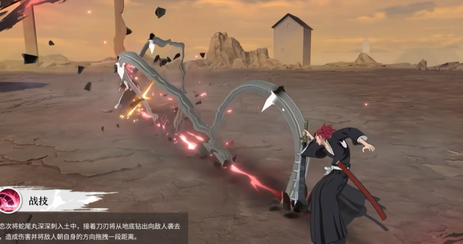 恋次降蛇尾丸深深的刺入土中,接着刺入土中的刀刃将会直接从地底下钻出来并且朝着敌人袭击,造成伤害的同时还能将敌人朝着自身的方向给拖拽一段距离,该技能一旦命中对手也能附加上怯懦的状态。