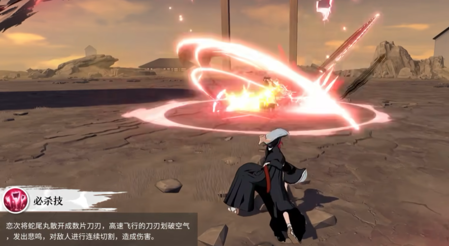 恋次的必杀技能可以直接让武器化身成为无数片刀刃,朝着敌人的方向快速的攻击,刀刃高速飞行时划破空气会发出悲鸣,一旦刀刃命中对手就会开始对敌人进行连续的切割,给敌人造成致命的伤害。