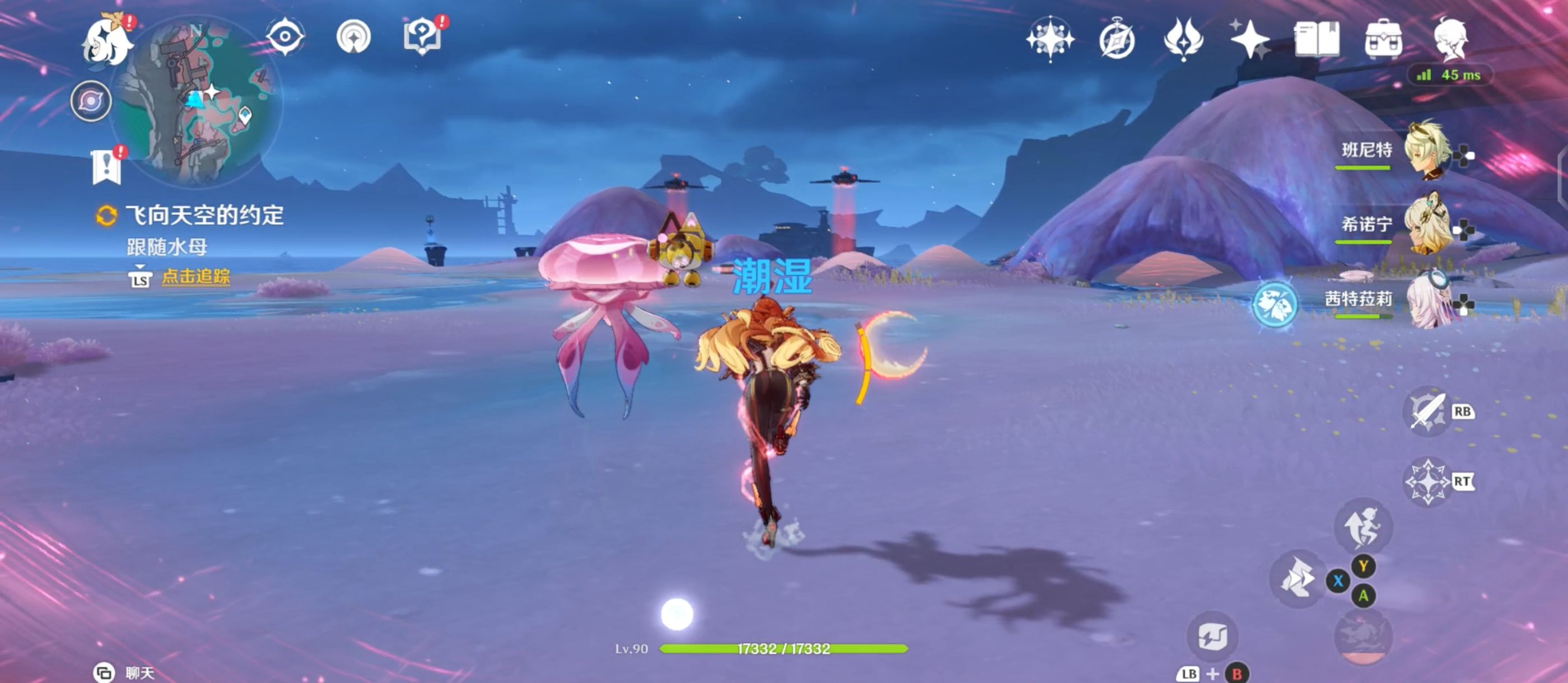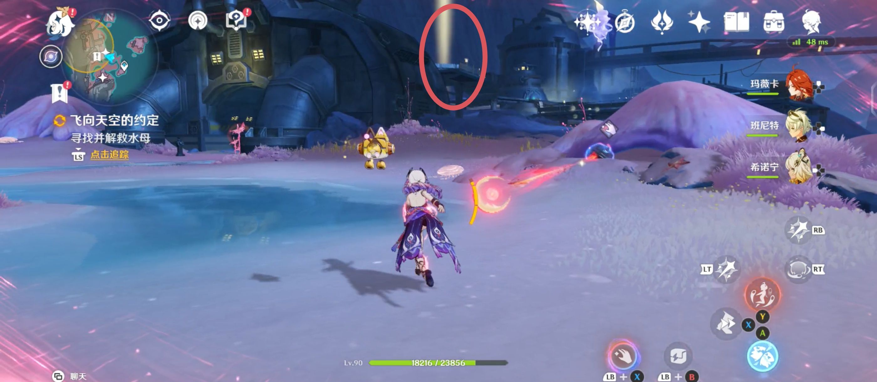 原神飞向天空的约定任务怎么完成,来到[挪德卡莱-月矩力试验设计局]右边的[绯沙盐沼],来到位置后,向右前方的建筑旁移动,靠近水母即可自动接取任务并进入对话。