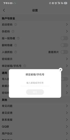1、我们打开暗盒app,然后点击右上角的齿轮状按键,然后就能够来到软件的功能设置界面,在这里我们下拉,就可以看到一个绑定手机号码/邮箱的功能,点击。
