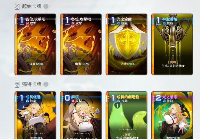 奥尔莱娅:不仅长得美,而且也很厉害,机制真的找不出什么弱点。作为一个辅助角色,就会把召唤还有回血等核心功能全部都焊死在技能中。核心的玩法自然就是靠神圣召唤技能,召唤出来的精灵卡牌就可以去保留回合,这也就意味着在高压战局中完全可以选择憋几轮,等到手牌成型之后,只需要一波召唤,就可以直接获取更多的收益。搭配专属的卡牌,光之意志,不仅可以奶200%的生命值,还可以让所有的卡牌都触发保留的效果。