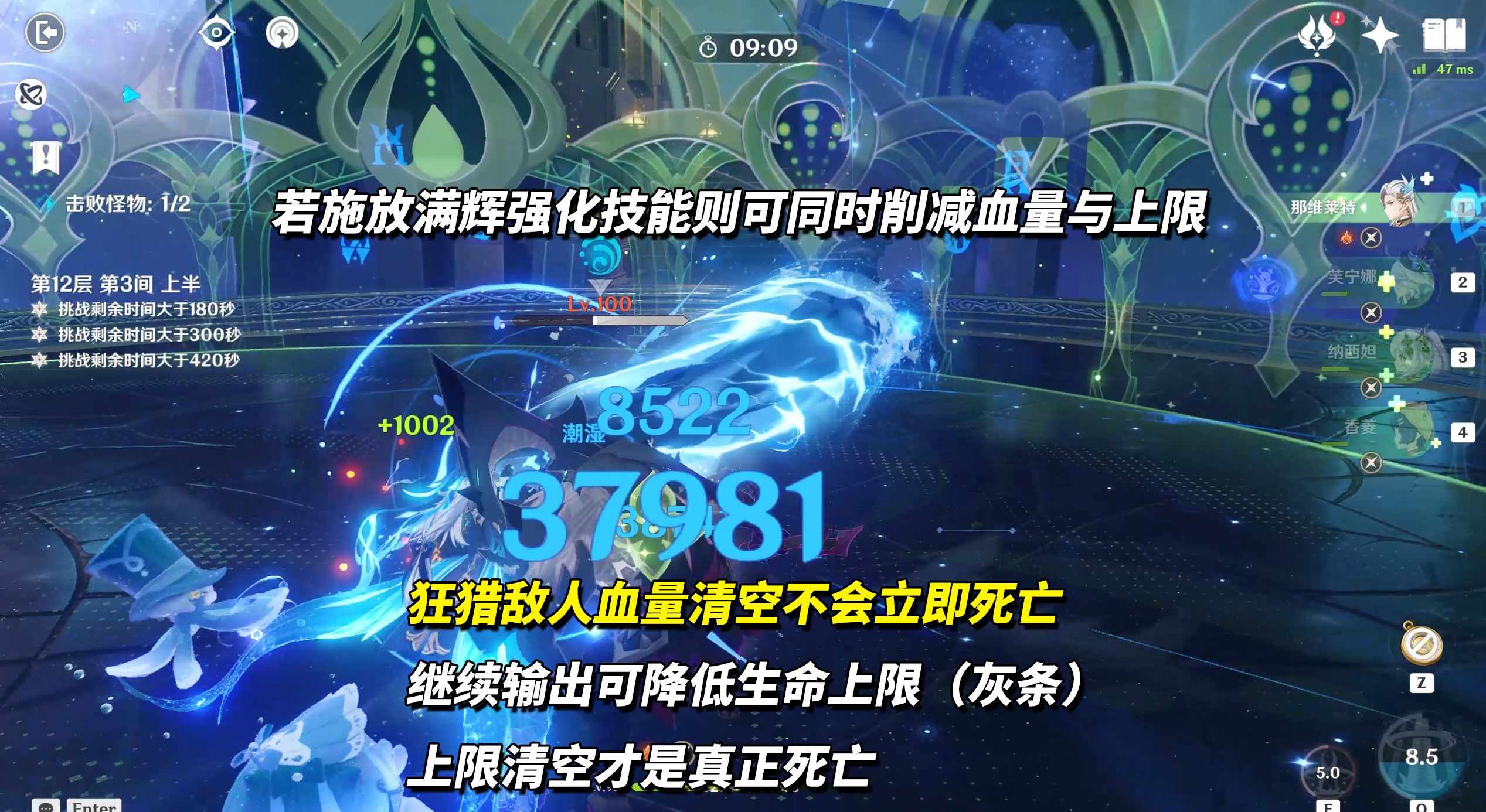 12-1下半,冰风组曲科培琉司(255万血)。当科培琉司将舞伴甩出去时,注意它手中动作,抬手会生成冰盾,易吞掉你的伤害,可等他先开盾用火伤破除后再爆发。盾量不高,班尼特/夏沃蕾等火辅就可破。