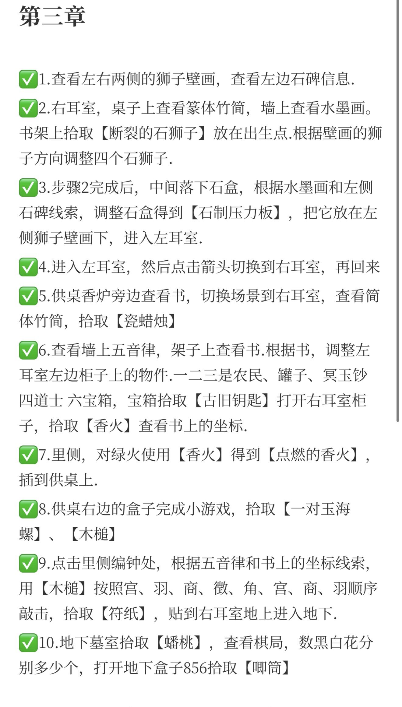 《缠重山2冥玉钞》第三章通关攻略:第三章需破解多处机关谜题。首先调整石狮子方向开启石盒,获取压力板进入左耳室。关键步骤包括:按五音律顺序敲击编钟;在地下墓室根据棋局数字856解开机关;最后依据动物特性正确摆放五个灵牌,并使用指魂灯引导鬼火,即可通关。