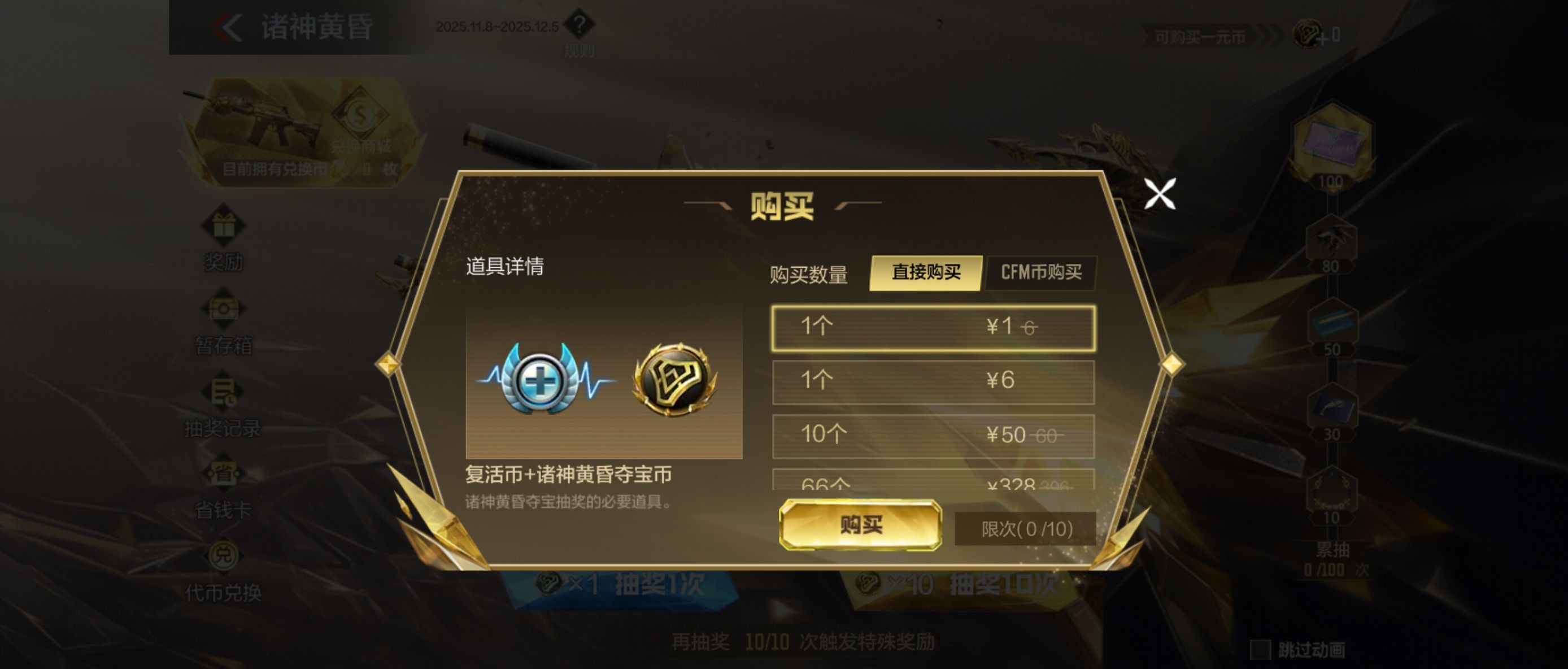 玩家在参加诸神黄昏夺宝的时候,需要了解,他其实通过抽奖的方式开展,而在抽奖的时候需要运用到代币,如果玩家单抽的话价格是6元,10连抽的价格是50元,目前部分商城还直接推出了一元购代币的优惠,所以玩家在选择抽奖之前,自己要决定是否要购买代币,毕竟在游戏当中,玩家其实是能够通过完成对应的任务来免费的获取代币。举个简单的例子,比如CFM币商城的20连抽福利,这样的话玩家其实就有机会低成本地获取代币。