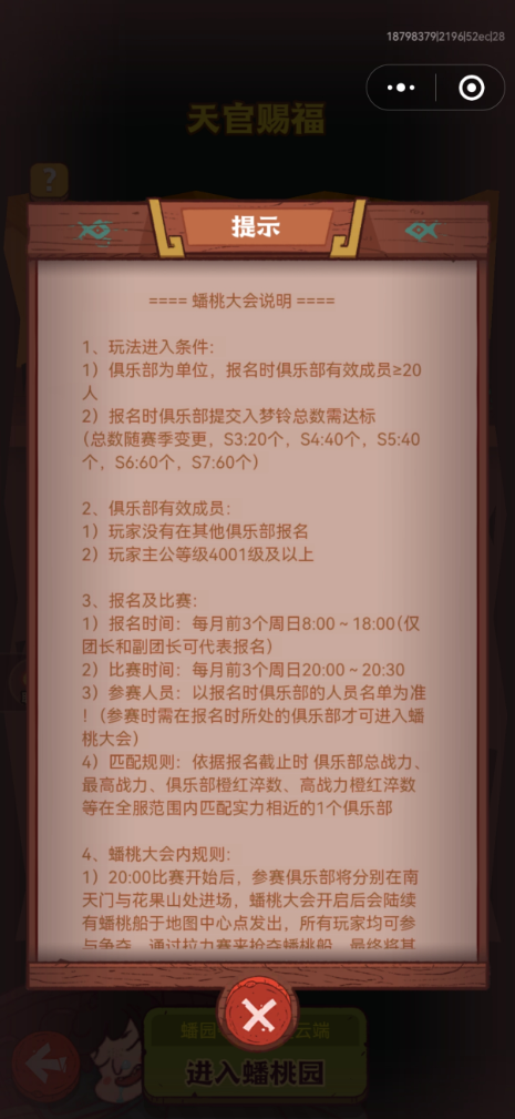 玩家想要参加蟠桃园的时候先要了解基础的规则,比如说俱乐部想要参加蟠桃园的时候需要里面的成员至少有20个人,并且要按照赛季提交对应数量的陆梦玲。另外玩家还需要注意在参加蟠桃园的时候,时间是在每个月的前三个周日的8:00~18:00玩家可以报名。当然报名也可以有对应的俱乐部的管理去操作,而比赛的时间只有30分钟。其实在比赛的时候玩家需要注意比赛将会在晚上的8:00~8:30,它其实会直接匹配两个俱乐部,进行1v1的实时对抗。玩家在参加比赛的时候,它们的最终目的就是抢夺蟠桃权控制权,并且要将船送到终点。这样的话,玩家就能够累积对应的积分,一旦最终的积分最高的俱乐部将会获胜。