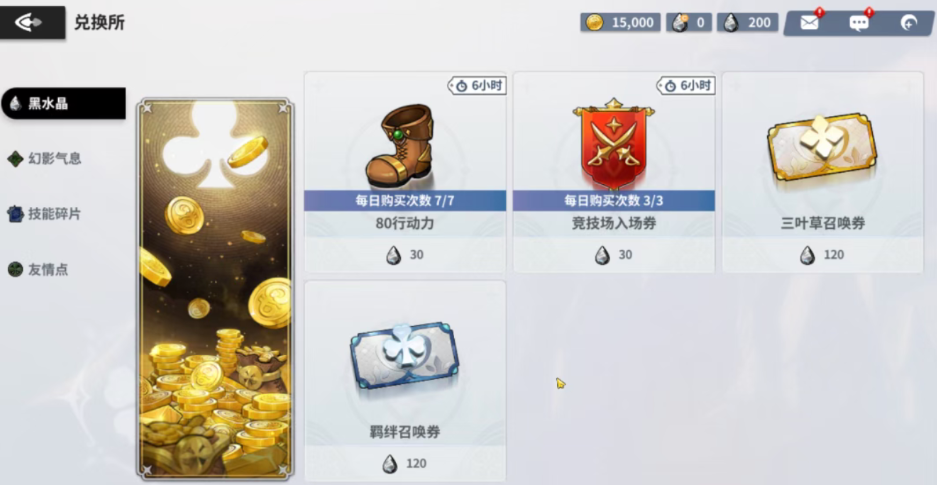 经验药水最主要的产出途径就是通过通关副本的方式来获得。小伙伴们在进入游戏之后,系统会给你颁发一系列的主线任务,玩家们在完成之后能获得各种货币道具,而在商城里面每一种货币都有不同的可以购买的东西,小伙伴们可以看到黑水晶和幻影气息这两种道具都是能够用来购买行动力的。行动力提升也就意味着你的战斗力能够提升,推进关卡的速度能够变得更快,而当你在解锁了第1章的第7个关卡之后,就将会解锁新的挑战,也就是青绿之森。