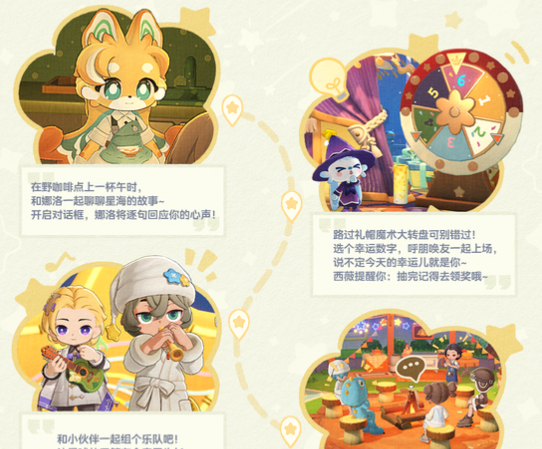 一旦在积攒果冻之后,自然就可以兑换惊喜的时刻。兑换处的货架早就已经摆满了很多的礼物,例如会有灵动的专属动作,还有神秘的瞳色。另外有各式各样的乐器,全部都会奏响星海乐章,让每一步都会踏出悦耳的旋律,而如果想要试一下手气,那不如直接用果冻去兑换礼帽魔术券。说不定金奖就在幸运转盘,大家可以去尝试一下。这里的美好并非只是在于奖品的兑换,在野咖啡座直接叫停娜洛,叫上一杯咖啡,然后问出自己心中的疑惑,其实也是一种享受。