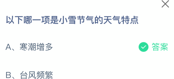 以上就是以下哪一项是小雪节气的天气特点,支付宝蚂蚁庄园2025年11月22日答案最新,更多精彩内容,请点击关注更新!