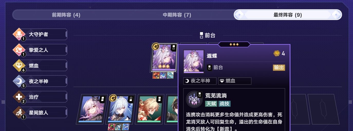 由于燃血羁绊中有不少夜之半神成员,加上夜之半神羁绊能通过挖矿令玩家变得更赋予,因此该流派有着极高的上限。玩家在实战中看组6燃血5夜之半神的阵容,也可直接7夜之半神4燃血,主输出为遐蝶,需在商店追出三星,其它关键角色有长夜月、镜流、罗刹、风瑾和丹恒藤荒,装备优先给遐蝶,其次是镜流,再有多的输出装给万敌打副C,其它辅助装优先让风瑾、丹恒腾荒装配,成型后遐蝶每次招出死龙都能削掉对手大半生命。