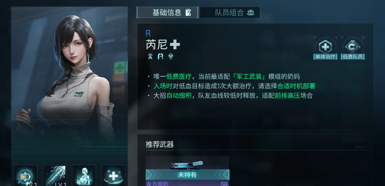 而且目前医疗角色相对来说用处比较多,不管是用作后勤保障也好,还是用作实战里面的支援也好,他们都是可以试用的,而目前大家要用这样类队员的话比较推荐的是橘子酱、芮尼、卡丽莎还有朝田这类角色,其中最推荐的是芮尼,芮尼虽然基础的品质不高,只有R级,但是她是游戏当中一个低费的医疗队员,而且还可以直接通过任务来获取,所以新手不费吹灰之力就可以拿到她,那么这里她在性价比上面也是最高的一位医疗队员,当前使用的环境非常多,芮尼如果上场的话是非常适配于军工武装这个模组的。