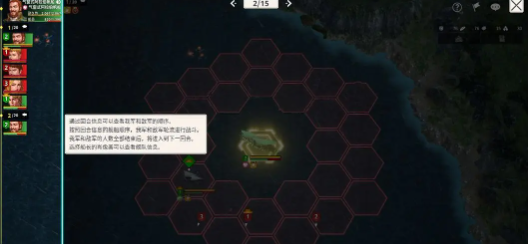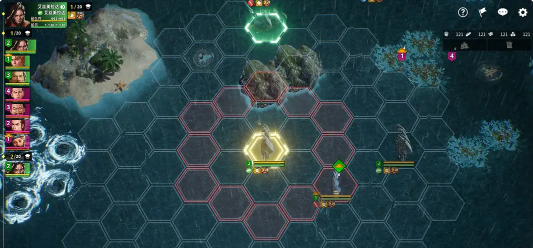 接着在旋转之后就会进入到战斗的界面,这就是回合制战斗。玩家就需要搞清楚三个点,分别是行动的顺序,战斗的目标,还有地图的格子。行动的顺序,主要就是看舰队的机动能力,屏幕的上方就会显示这个回合还有下一个回合的顺序。提前知道谁先出手,然后就可以做好战术的规划。战斗地图是六边形的格子,蓝色细边框,就是一个可以移动的区域,红色细边框,这是一个攻击的范围。点击格子之后,还可以预览移动以及攻击的路径,并不需要担心踩空。
