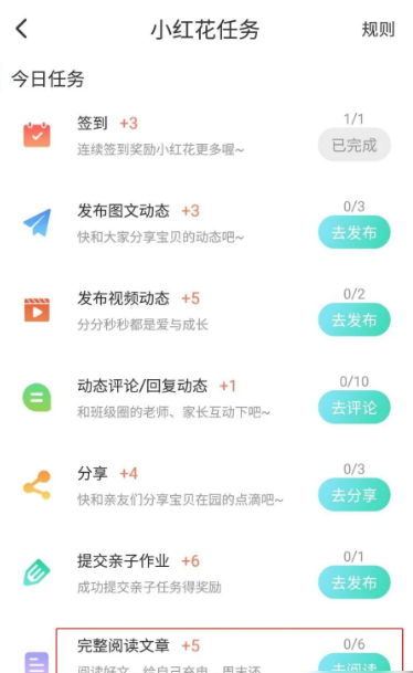 弹出“小红花任务”界面,我们可以看到今日任务下有很多任务可以选择:签到、发布图文动态、分享、完整阅读文章等,后方有完成每一个任务课获得的小红花数,这次我们选择“完成阅读文章”;
