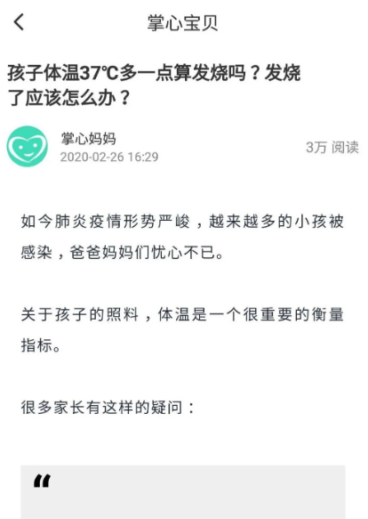 “宝宝安全”里面是针对宝宝生病的一些常识和建议,我们选择第二篇文章:孩子体温37°一点算发烧吗?发烧了应该怎么办?,点击文章;