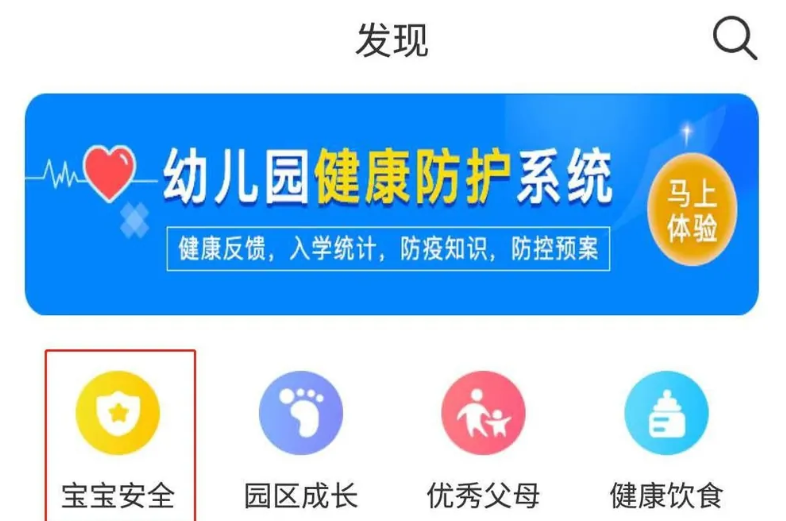 进入“发现”对话框,下方有四个版块:宝宝安全、园区成长、优秀父母、健康饮食,我们可以选择任一版块内容阅读。这里我们选择“宝宝安全”;