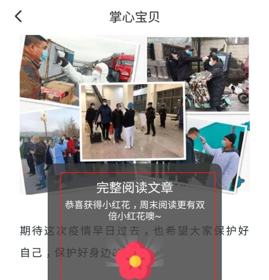 阅读文章完成之后,会弹出对话框:完整阅读文章,恭喜获得小红花,+5小红花;