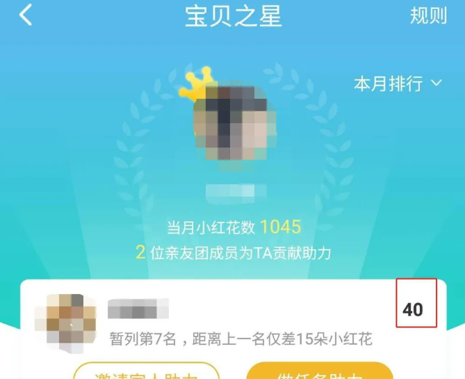 如果我们想增加小红花数,提高小朋友的排位,宝贝之星中的任一个小朋友头像,进入“宝贝之星”;可以看到我们暂列第七名,据前一名仅差20朵小红花,我们的小红花数是“35”朵。我们点击下方的做任务助力;