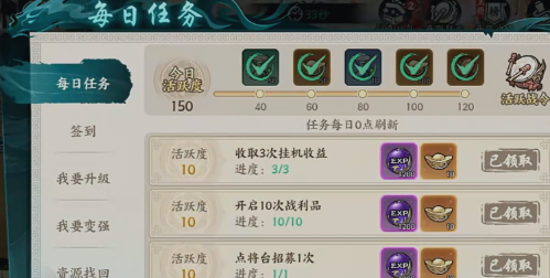 每日任务不要忽略,虽然单条任务经验并不是很顶尖,但主要的就在于稳定,拥有额外的福利。每天花10分钟完成签到,开启战利品领取挂机收益,可以拿到经验,还可以积攒活跃度。到了后期就可以兑换宝箱,里面有大量的经验包,还有元宝道具。所以现在每天需要做的任务就是提升150活跃度,单是经验奖励就可以升半级,长时间坚持下来,等级自然就会拉开。要是遇到卡等级时,那每天任务经验就成为了救命稻草。
