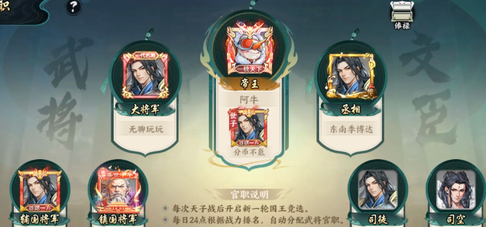 最后也提醒大家官职会略微的带来加成战功,例如每天24小时就会根据战功的排名,然后去分配官职。此时对玩家而言,就可以获取额外的福利。太守竞选是在12:00~14:00开启,如果当天战功比较高,就有机会参与竞选,收益是比较丰富的,其中就会包括武功秘籍。平时可以选择多刷取一下,成功的几率可以提升。