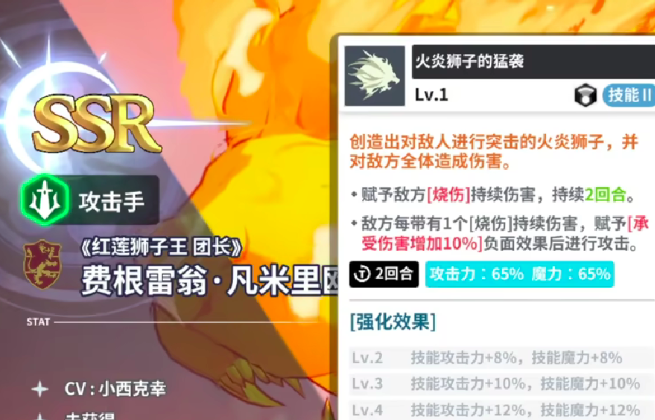 若将其被动进阶至更高层次——“火炎狮子的猛袭”,则穿透伤害将直接提升至10%,同时在烧伤生效期间,总伤害增幅可达30%。这一强化使得费根雷翁即便面对多单位集群或具备高抗性的对手,也能维持稳定的输出节奏。凭借此强度,他在当前版本中已稳居火焰属性输出者的T0梯队,是组建燃烧阵容时不可替代的核心主力,建议始终将其部署于主C位置。