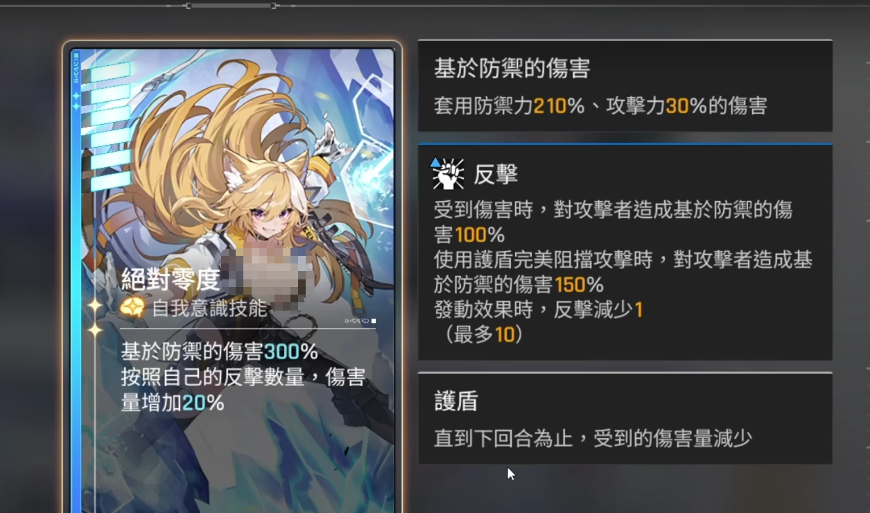 游戏中这个角色主要是以两部分所构成,一部分是属于反击的技能,另一部分则是护盾类型,并且在游戏中反击的技能与互动能力形式捆绑在一起的,当玩家们受到攻击所反击成功时,玩家们就会获得护盾,是非常不错的技能,除此之外还可以增强这个角色的输出伤害,在进行反击的时候也能强化成,能够对敌人的所有单位都造成伤害,在游戏中他也拥有着自己独特的灵光一闪辅助增益。
