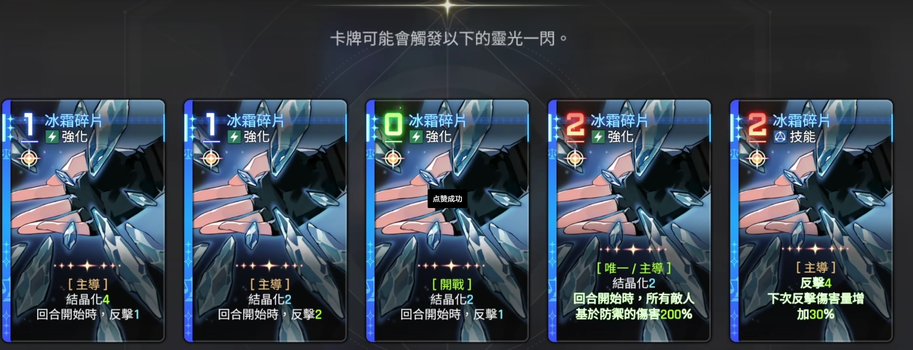 他的技能一冰霜碎片有着自己独特的灵光一闪技能,在他的灵光一闪之后依然有着五个卡牌供玩家们选择,第一个是玩家们可以拥有4个结晶化,并且在回合开始时就可以可以拥有一次反击;第二张卡牌则是可以结晶化2,并且在回合开始时能够得到两次反击;第三张卡牌是拥有结晶化2,回合开始时反击1;第四张卡牌则是可以有结晶化2,并且在回合开始的时候所有的敌人他的基础防御伤害都会增加200%;第五张卡牌则是可以反击4,并且在下一次反击时他的伤害会直接增加30%。