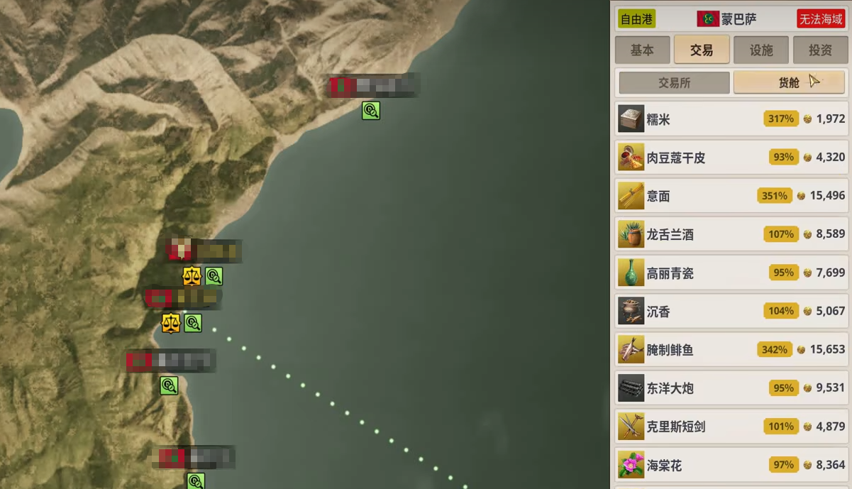 想在大航海时代当一个成功的商人,光知道哪里有资源还不够,不仅要知道哪里有货,还要知道什么时候出发,每个港口的商品都有自己的基准价,要是看到某个商品的价格低于基准价,就可以多买一些,要是高于基准价就赶紧卖掉,这是贸易最基本的逻辑,每个港口都有自己的特产,比如里斯本的杏仁、威尼斯的玻璃、马六甲的胡椒,这些特产的价格差通常比普通商品大,比如在里斯本买杏仁,运到北欧卖掉,利润比卖普通布料高很多。