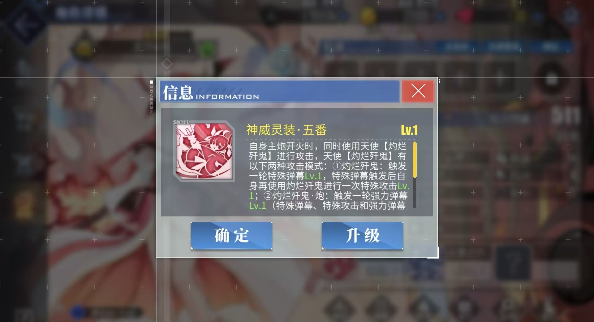 当五河琴里的主炮转好并进行开火时,她的天使灼烂歼鬼也会一并发动攻击,初始默认为模式一,触发时会发射一轮特殊弹幕,不管是否能命中敌人,都会令灼烂歼鬼再次进行一次特殊攻击,而在模式二时,灼烂歼鬼会发射威力更强的强力弹幕。两种模式会在五河琴里每次发射完主炮后交替更换,玩家无法指定灼烂歼鬼使用某一种模式进行攻击。因此,五河琴里开火时,她所造成的总伤害其实为主炮伤害与灼烂歼鬼伤害的总和,并且凭借灼烂歼鬼的弹幕效果,令她有着极强的清杂能力。