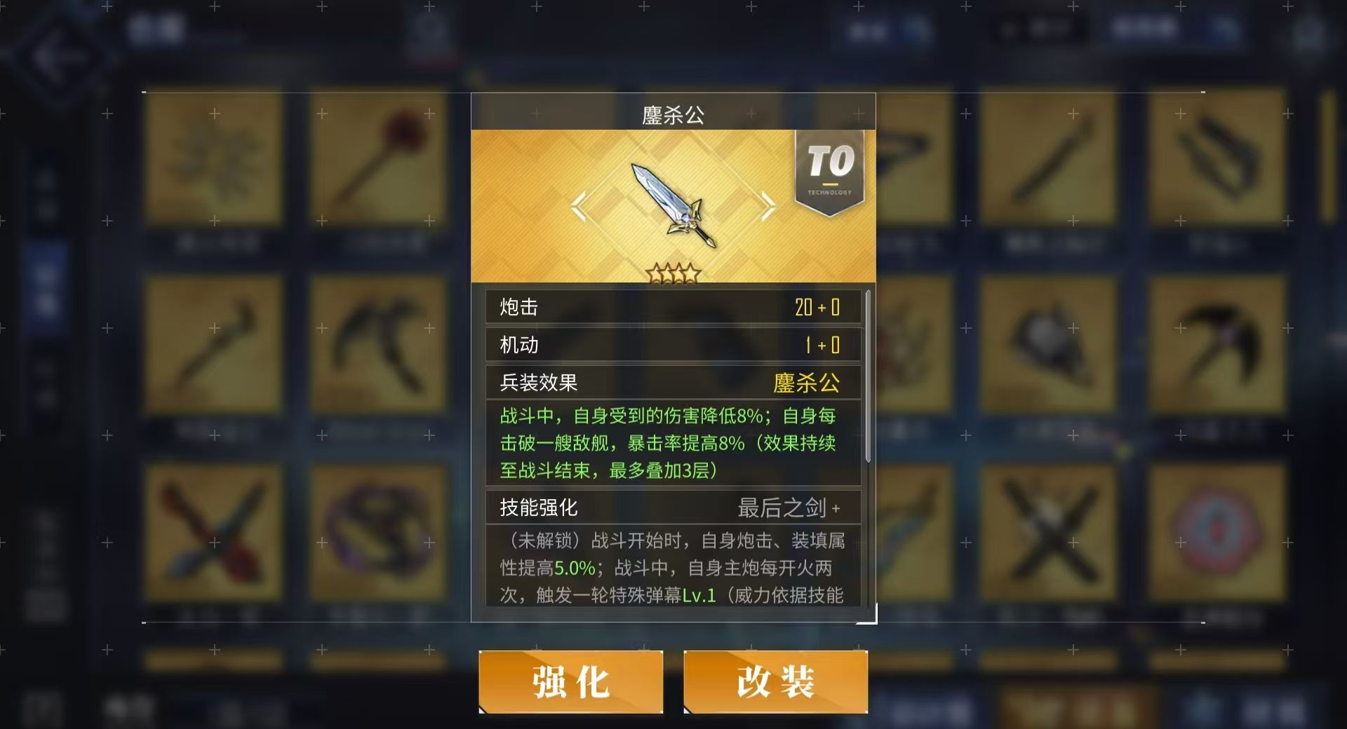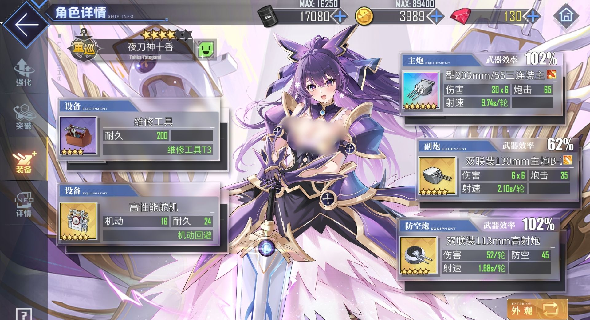 此外,夜刀神十香的专属兵装鏖杀公还能令她永久获得伤害降低8%的效果,并且每当她击败一艘敌船后,还能为自己增加8%的暴击,此效果最高能叠加三层,一旦获得就能持续到战斗结束,中途不会失去任何已叠加的层数。而在舰娘装备的搭配上,常规的彩重巡炮夜刀神十香都可携带,没有的话给她装欧根炮或巴尔的摩炮也很不错,副炮栏用每月能兑换一次的B13即可,也可用金128,防空炮则选最泛用的金113,两个设备栏则以传统重巡配装为主,金舵机加维修工具的组合能帮助夜刀神十香应对大部分作战环境。