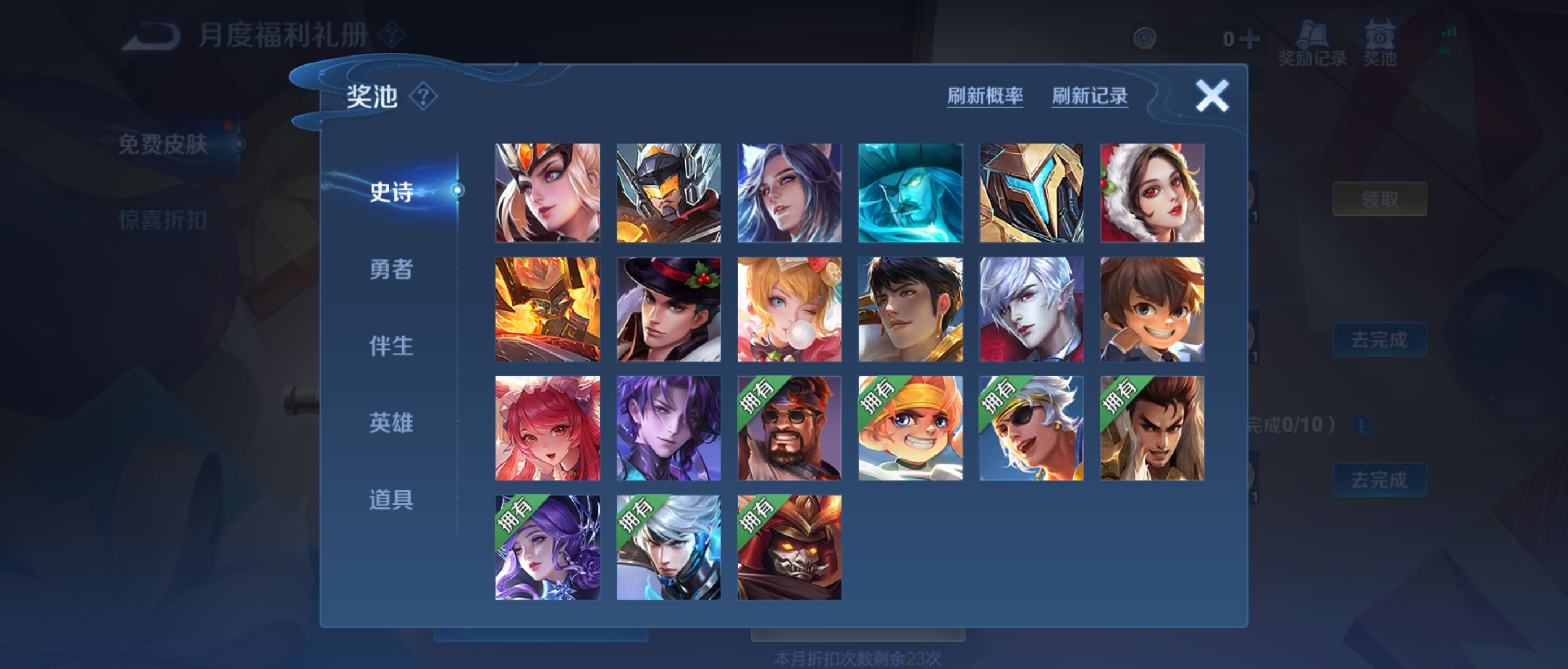 保底机制对玩家来说还是很实在的,累计刷新120次就可以获取之前没有拥有的史诗级别皮肤。福利还是比较实在的。另外,如果刷到已经拥有的勇者皮肤,也并不需要觉得可惜,系统就会自动的替换成4张积分夺宝抵用券,可以积少成多。说不定用抵用券就能有机会拿到荣耀水晶。这里也有一个时间点需要记住,10月份的活动在10月31日已经正式的关闭。刷新的次数虽然可以跨越继承,但是货币不能够保留。