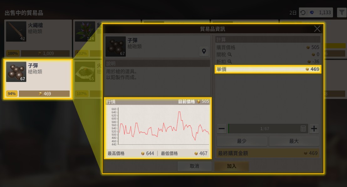 交易任务5的主要目的就是买卖某种货物,有时还要跨地区运输。任务虽然简单,但是真正开始操作后就会发现商品是否有利润、港口库存是否充足、途中是否会遇到灾害等都会导致结果的偏差。玩家在获得任务后首先要查清目标商品的产地,然后同周围港口的交易价格进行对比。目标港口离得太远的话,应该配用提高航速或者减少疲劳的配件来节约时间。