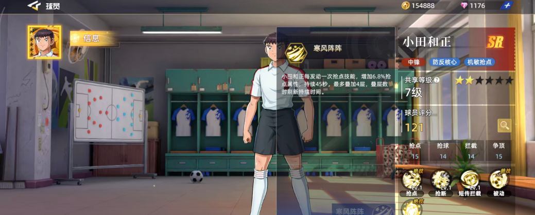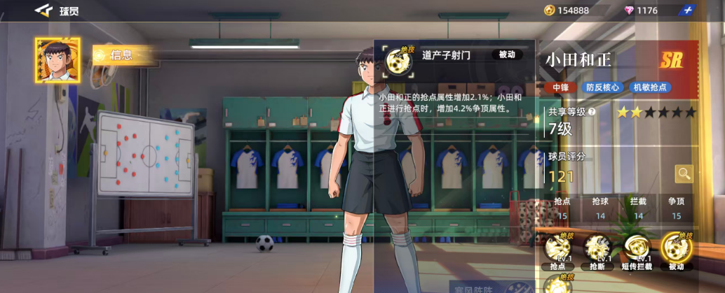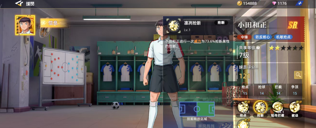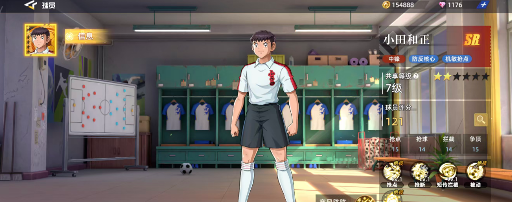 作为初始可获得的SR级球员之一,小田和正拥有清晰的场上定位——中锋。他的技能体系特别适合防反打法,机动性强,反应灵敏。基础评分为121,在同品质球员中处于中等偏上水平。其关键属性如抢点15、抢球14、拦截14、争顶15,体现出他在空中对抗和防守落点方面的优势。六维图中抢球数值相对偏低,仅为14,因此在实战中应尽量规避直接拼抢,转而发挥他在其他维度的均衡能力。