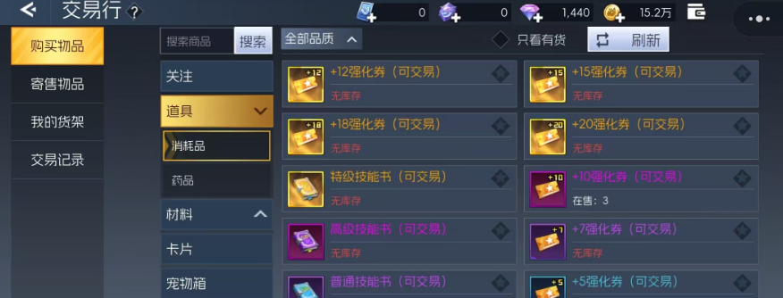 前期大家如果是想要购入各种道具,可以进入交易行页面里面直接选择购买,其中上架的商品都是其他玩家不太需要的材料,那么系统当中大家也可以根据自己想要的类别来进行筛选,如果是想要针对一些稀有类型的物品进行购买的话,这里还提供了一定的搜索栏,通过输入关键词就可以快速的找到自己想要买的商品,在具体商品当中,大家不仅可以看到目前上购玩家设定的商品,价值还可以看到目前商家的数量有多少,如果库存比较多的话,可能这个商品的价格就会比较低一些。