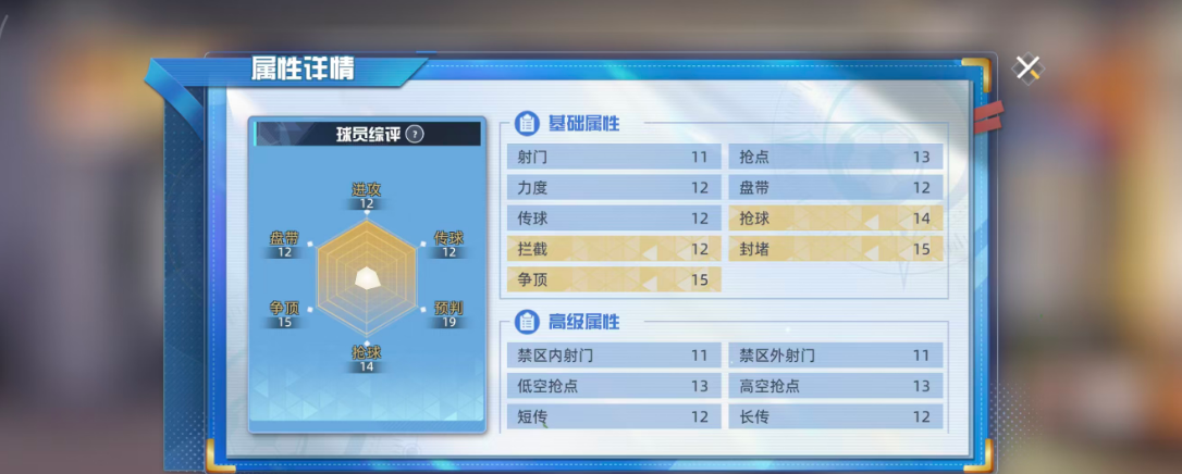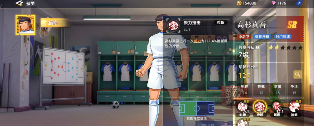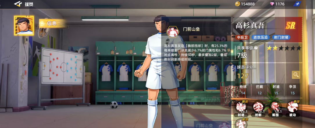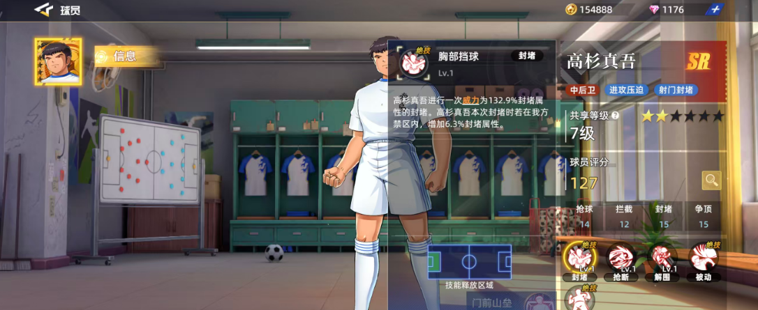 高杉真吾作为前期用的比较多的一个SR球员,放在中后卫才比较好用,如果用高杉真吾来作为进攻的主要核心,其实他带来的压迫力也是很大的,利用自身的射门动作加上封堵优势,可以带来的位置效果也能够配得上这样的品质设定,目前他在整体的球员评分当中获得了127的评分,球员现在的六维图当中他有一个很明显的短板,在抢球效果当中只有14的评分,其余抢球14、拦截12,封堵15、争顶15都是比较均衡的,也都是后期在中后卫的位置上面可用的能力。