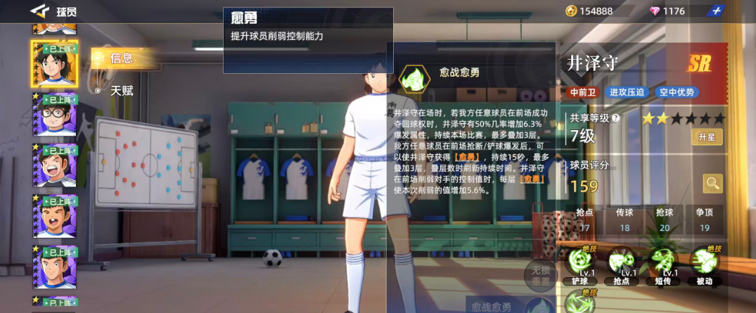 井泽守作为SR球员后期如果强度不够的话,就放在前期过渡期使用完全足够,因为在中前卫球员里面其实井泽守能够造成的进攻压迫反而是不出的,且井泽守最独特的一点是具有一定的空中优势,这一点的话基本是其他球员无法替代的,井泽守在整体的球员评分上面有159的评分,比一般的SR球员还是还要高那么积分的,在其中大家可以利用到的还有抢点17、传球18、抢球20、争顶19这几项数值,因为根据目前的六维图来判断井泽守的属性效果都是比较均衡的,当然其中最突出的是预判这项属性的分值,有22分的基础上面他做中前卫就没有问题了,其他的几个比较游优势的属性就是上面提到的这四个,所以球场上面比赛的话这几项动作都是他会常用到的。