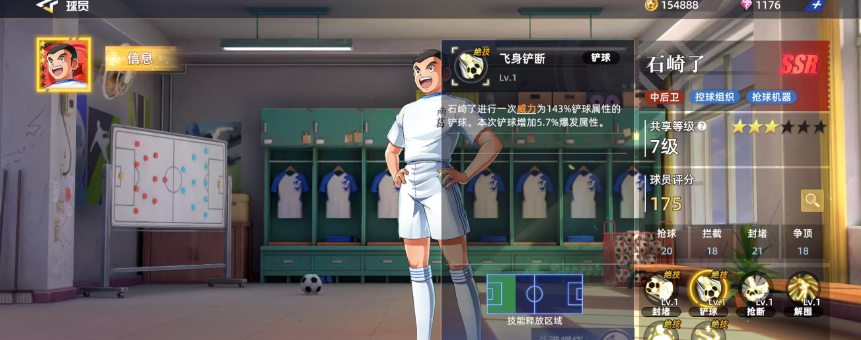 另外在飞身铲断这个技能上面,石崎了带来的是一次威力为143%铲球属性的铲球,因为本身他的抢球动作就比较多,这里利用这样的铲球动作就可以增加5.7%爆发属性,也让石崎了有更多的抢球成功概率,其次在奋力抢断这个技能当中,石崎了是会发动威力为120.2%抢断属性的抢断,这里的话大家也可以看作是一个抢球权的动作,而聚焦争顶的技能则是根据石崎了的基本属性,带来数值为120.2%争顶属性的动作,所以在这几个技能使用的方面,大家只要依靠他的基础数值以及技能当中带来的百分比就可以更快获取我方的球权移动效果。